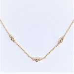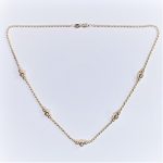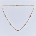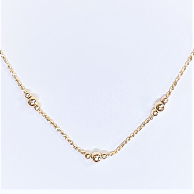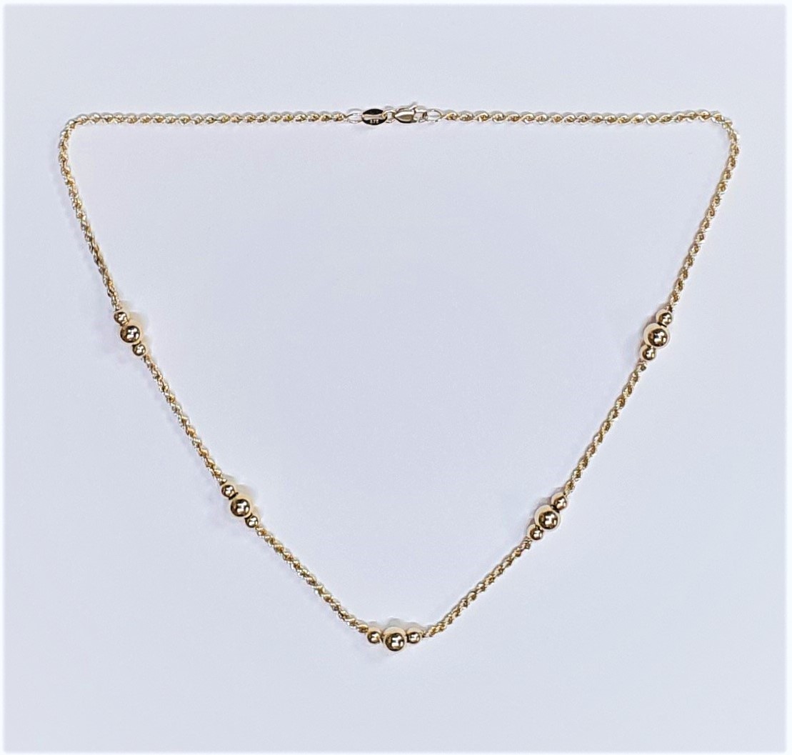 Made with 9ct yellow gold tube. A twisted rope pattern chain with five sets of spaced three graduated round gold beads.