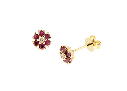 City of London Jewellers present these gorgeous 18ct yellow gold Flower stud earrings each Set with a single sparkling round diamond centre, with a halo of bright red rubies.