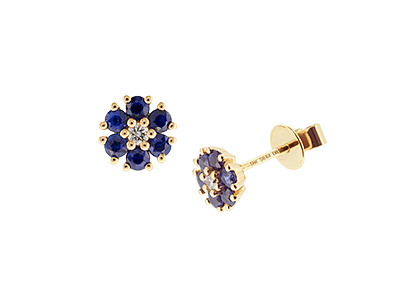 City of London Jewellers present these gorgeous 18ct yellow gold Flower stud earrings each Set with a single sparkling round diamond centre, with a halo of bright vibrant blue sapphires.