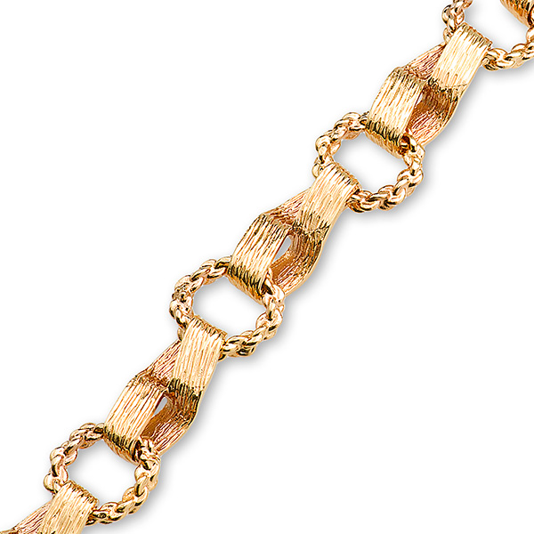 This gorgeous robust 9ct yellow gold bracelet with eight solid ribbon style links, hand finished with a tree bark pattern and brought together with round solid links of a twisted rope design. Hand made in our London workshop.
