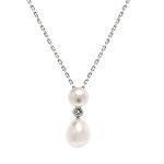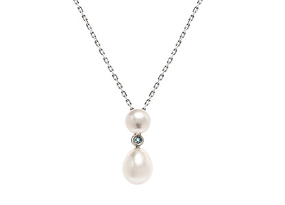 A gorgeous 9ct white gold pendant with one round and one oval cultured pearl, separated with a lovely sky blue Topaz, available with a sparkling diamond cut trace chain. This stunning pendant is perfect for adding an elegant finishing touch to any outfit.