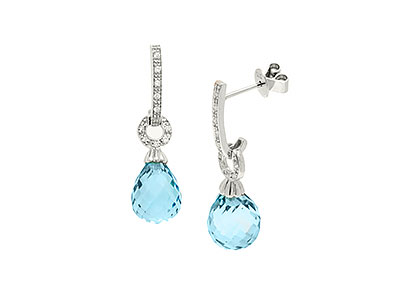 Simply stunning, these beautiful 9ct white gold diamond drop earrings are encrusted with eleven round brilliant cut white diamonds and a sparkling sky blue teardrop briolette cut topaz in each earring.