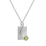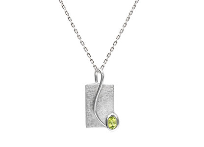 This stylish, modern 925 real silver pendant has an anti-tarnish rhodium finish with a frosted matt background, overlaid with a contrasting high polished wire branching across to a beautiful oval apple green peridot stone, in a secure rub over setting. Suspended on a gorgeous diamond cut trace chain,  all with an anti-tarnish rhodium finish.