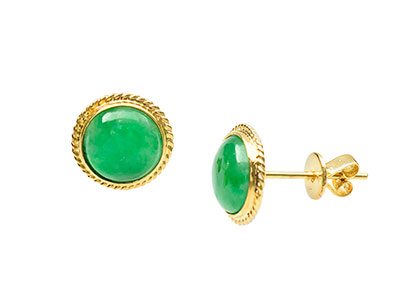 These stunning, decadent green-enhanced jade stud earrings have a tactile feel with a smooth round cabochon cut stone. Set in 9ct yellow gold rub-over settings and enhanced with a beautiful twisted gold wire design.