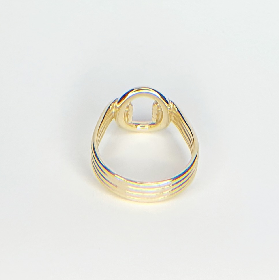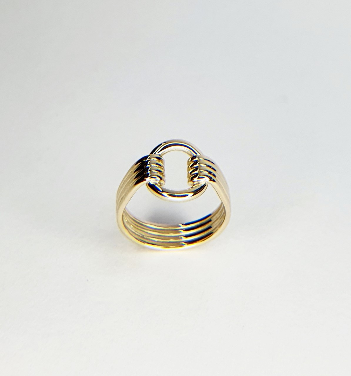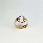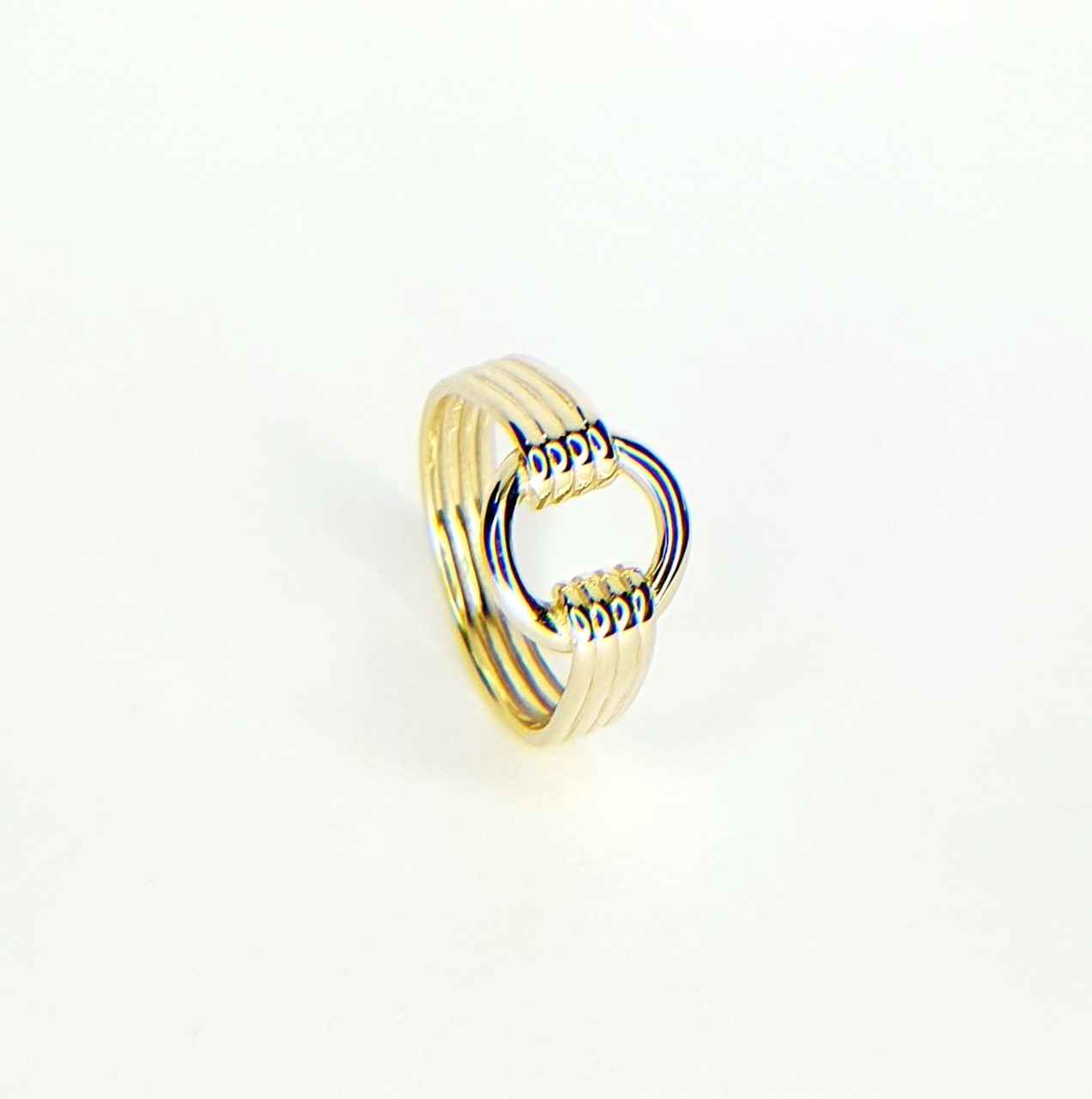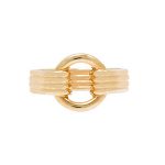 An unusual art Deco style four strands of yellow gold clasping onto the circle that is shaped to the finger.