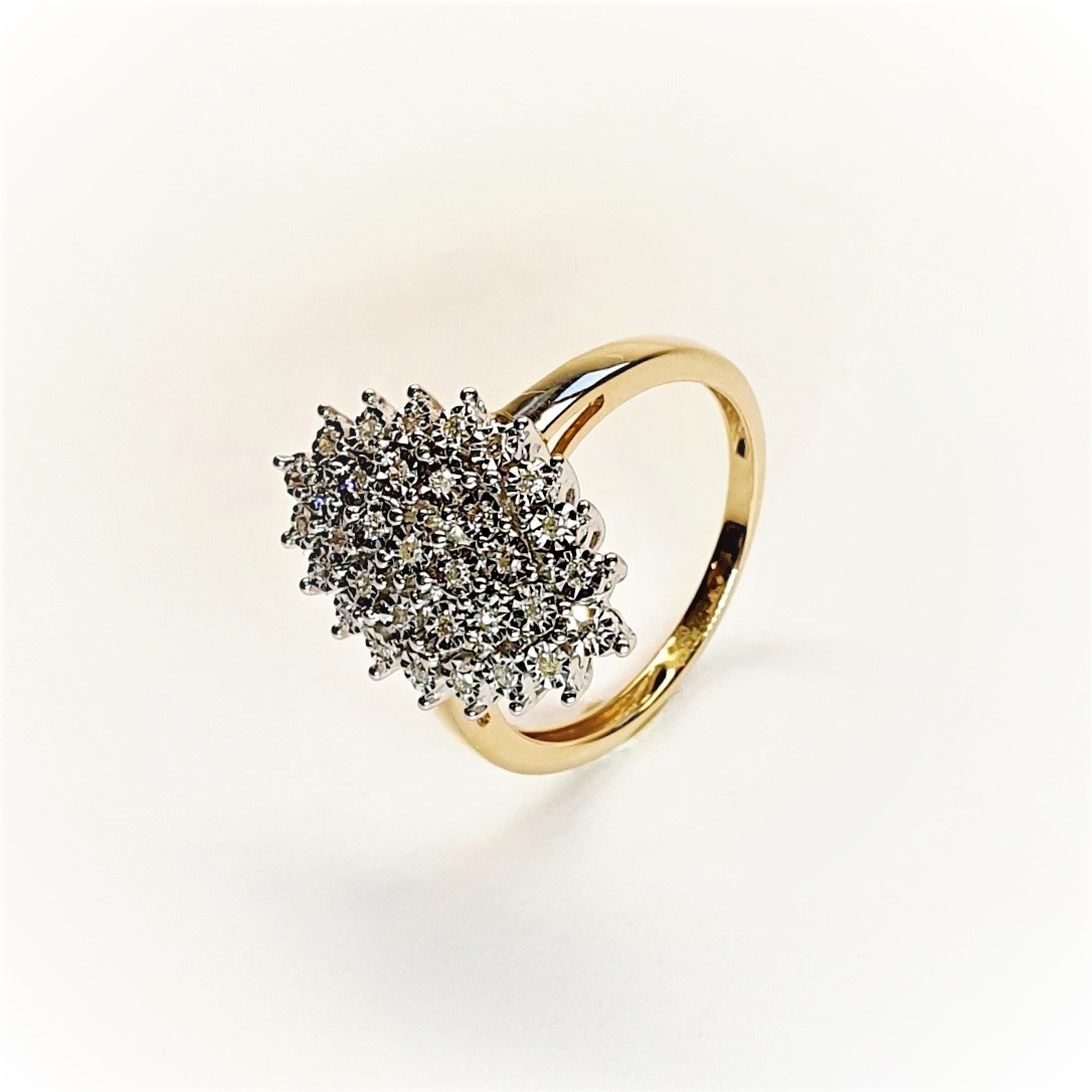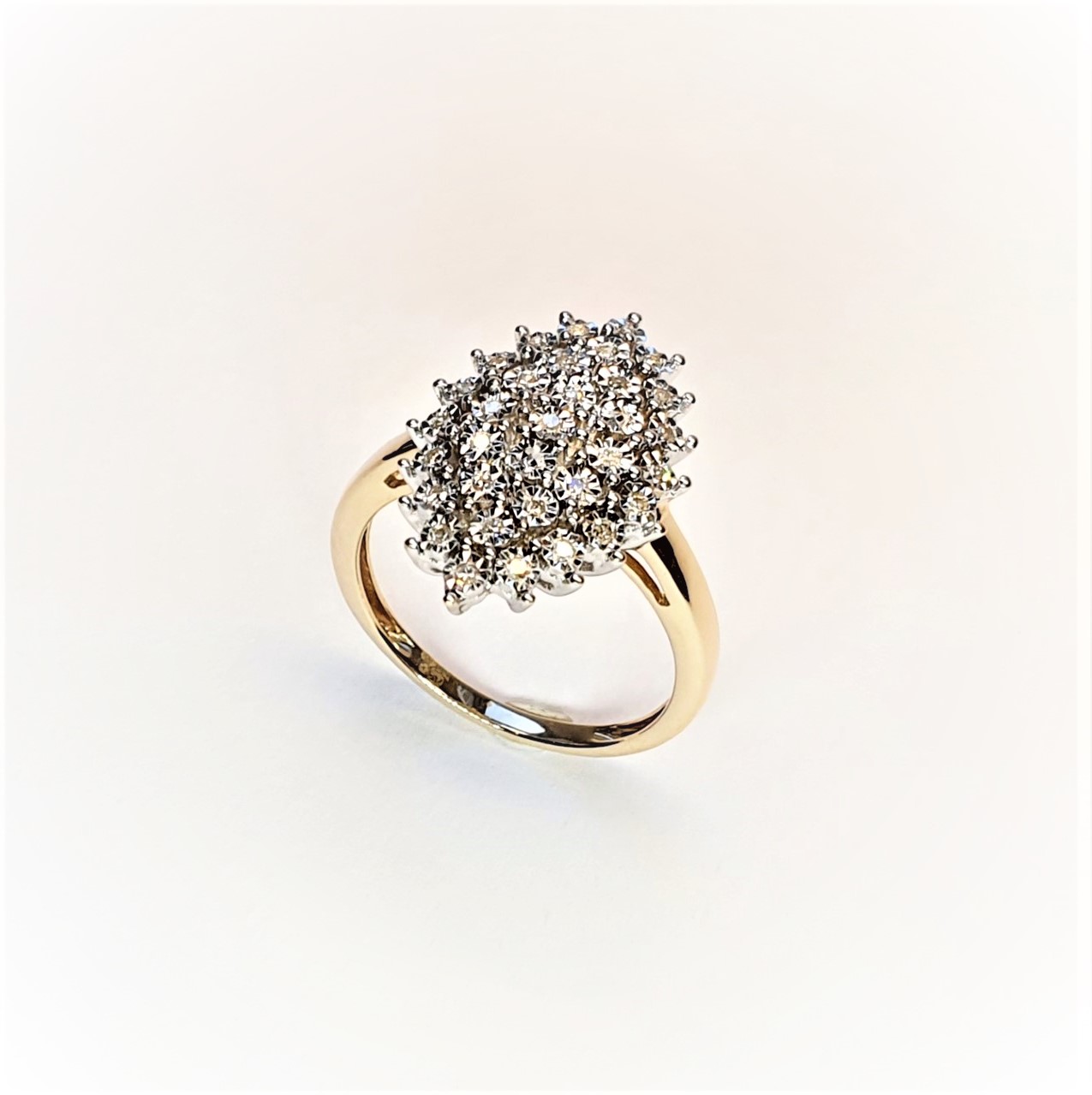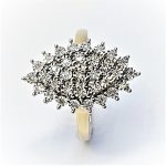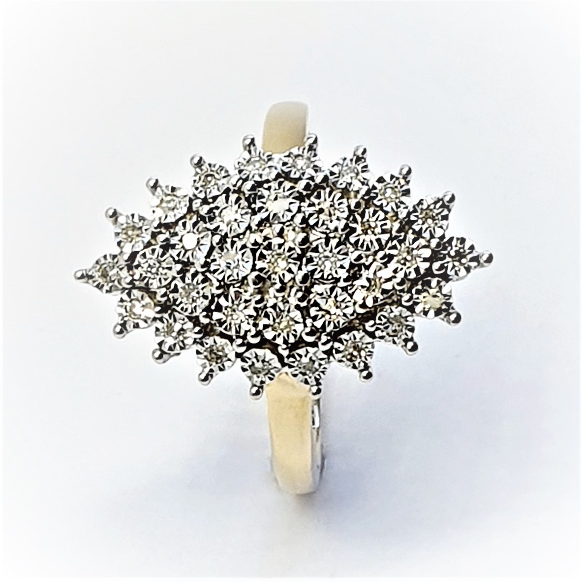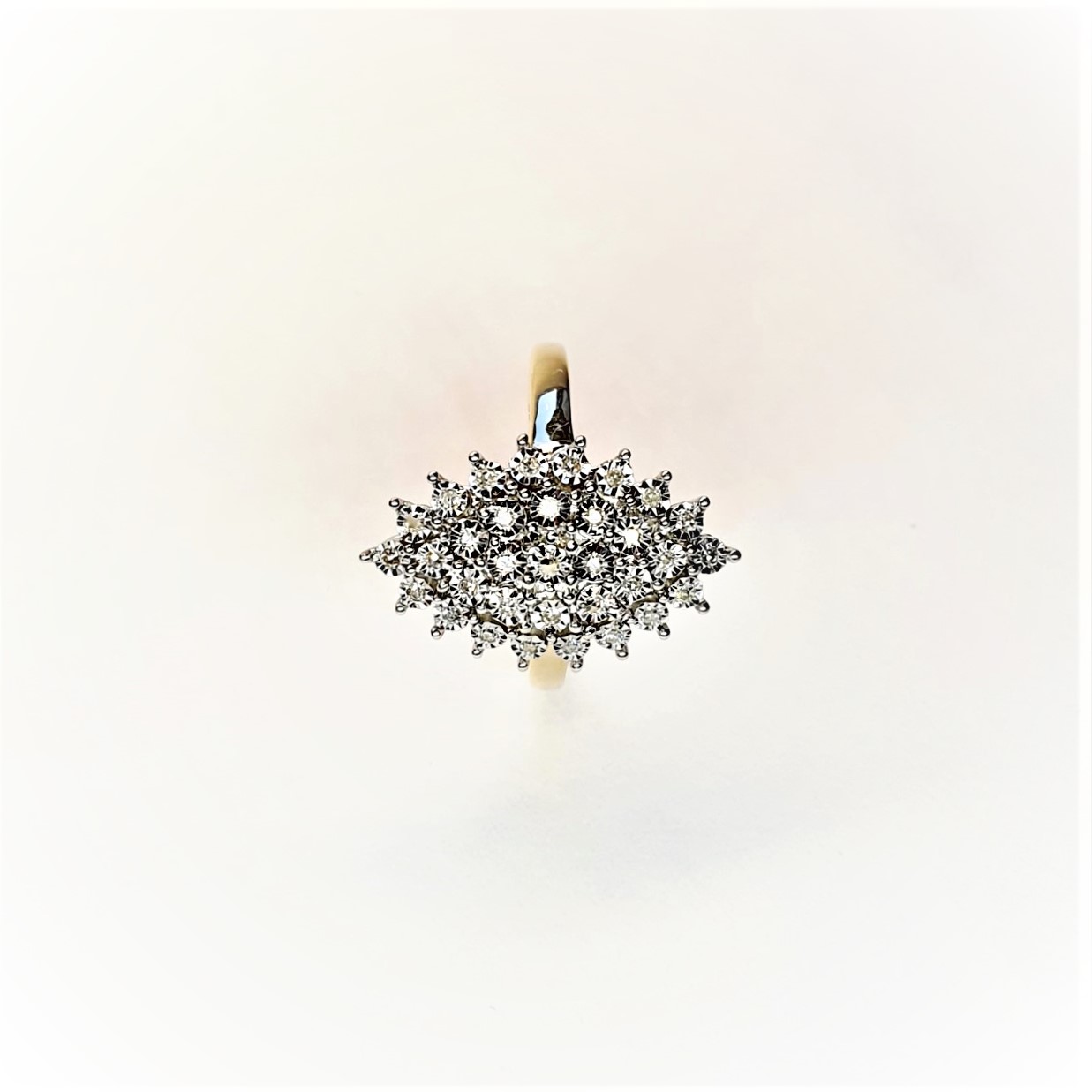 Made in 9ct yellow gold with white elusion set diamonds, an unusual Marquise shape cluster ring in perfect condition.
