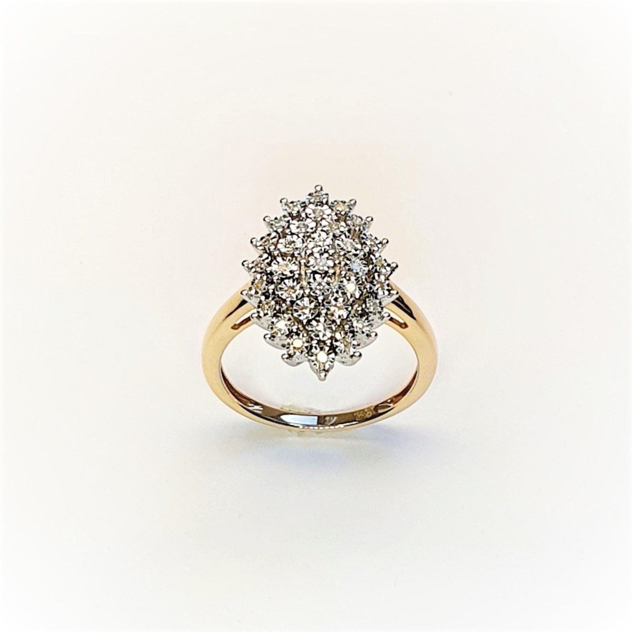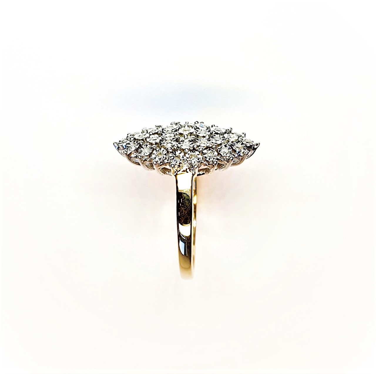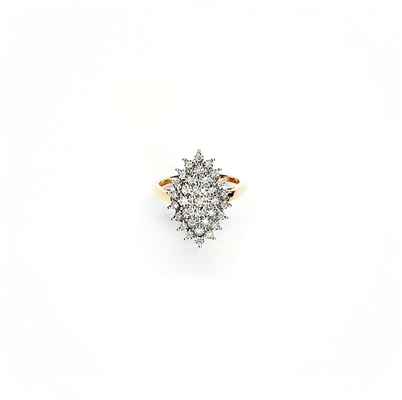 Made in 9ct yellow gold with white elusion set diamonds, an unusual Marquise shape cluster ring in perfect condition.