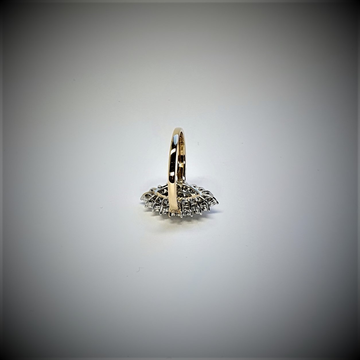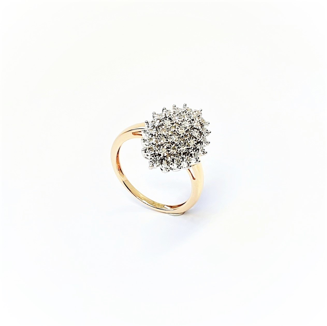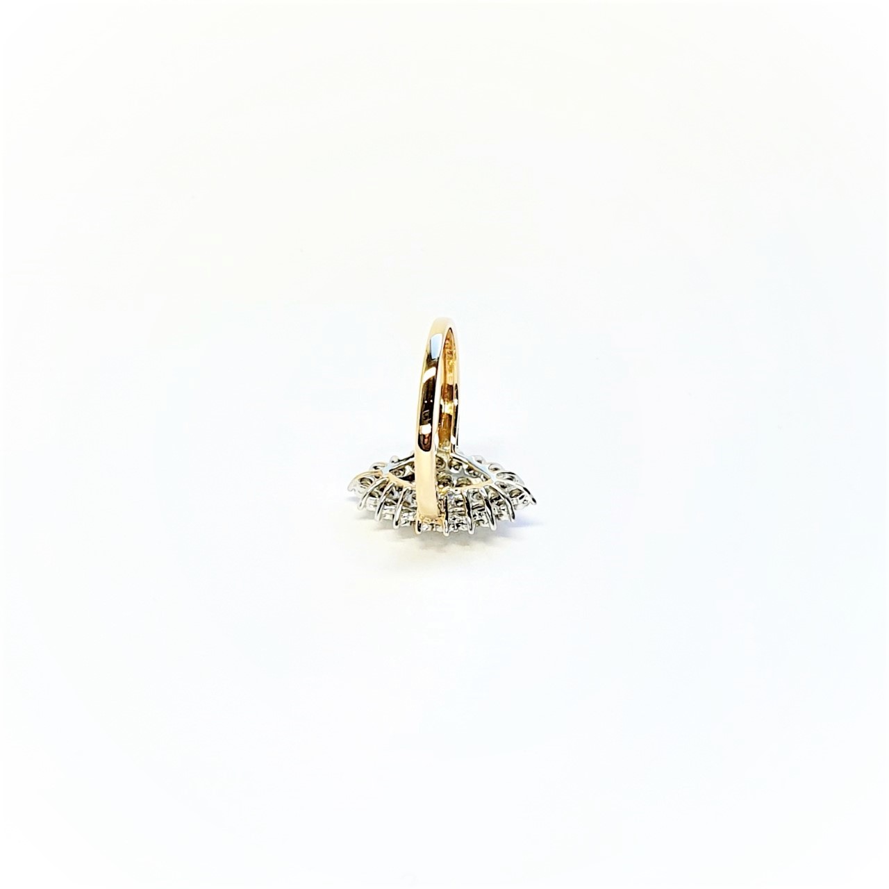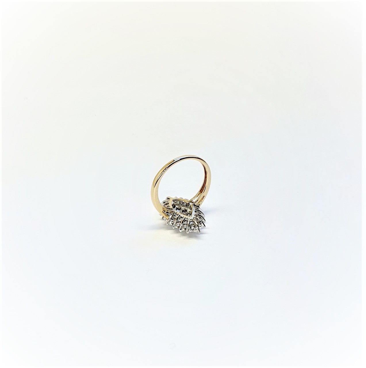 Made in 9ct yellow gold with white elusion set diamonds, an unusual Marquise shape cluster ring in perfect condition.
