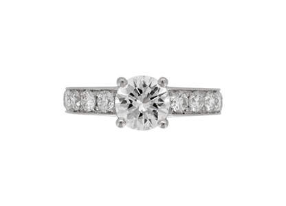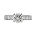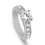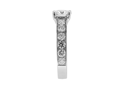 The most commonly used setting for the round cut diamond engagement ring is the 4 prong setting. Not only is the 4 prong setting very secure, it is also a very open setting, allowing the optimum amount of light to enter the stone. For round cut diamonds over 2 carats, a 6 prong setting may be required to keep the stone secure. The bezel setting, while unique and modern, is less used for the round cut diamond as it will prevent a large amount of light coming through, which is one of the key selling points of round cut diamonds.