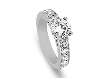 Simply breath-taking, a single round brilliant cut dazzling diamond of 1.29cts taking centre stage, with a further six sparkling diamonds cascading gracefully down each shoulder all set in the most durable pure and rare metal of all platinum. The perfect ring to surprise the lady in your life and reveal your true sense of romance and everlasting love, for your new life together.