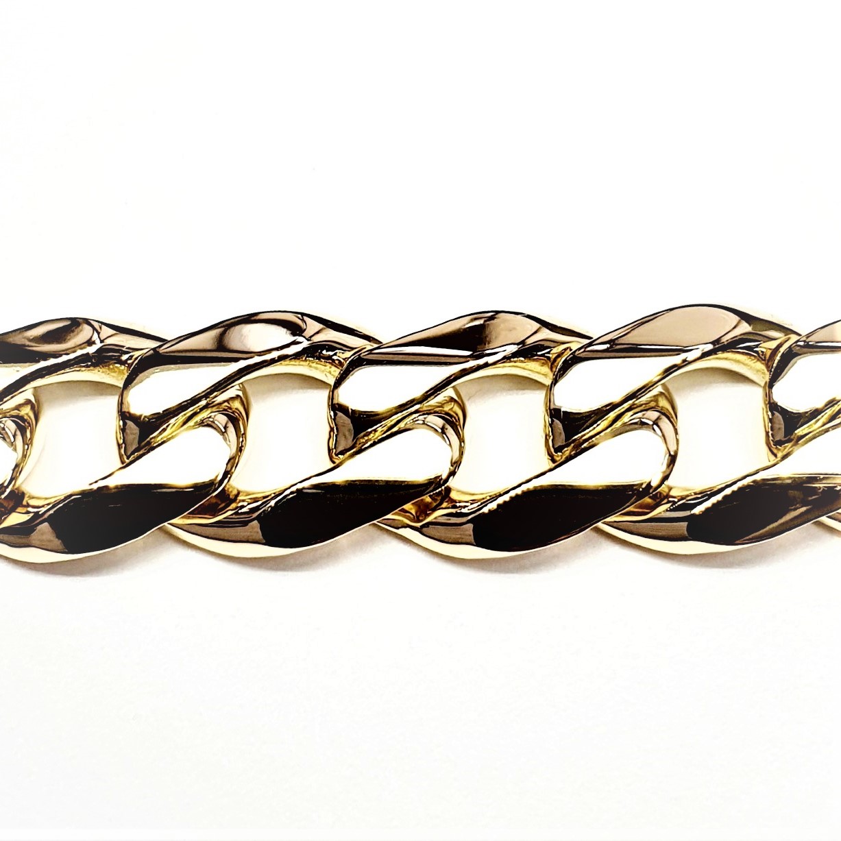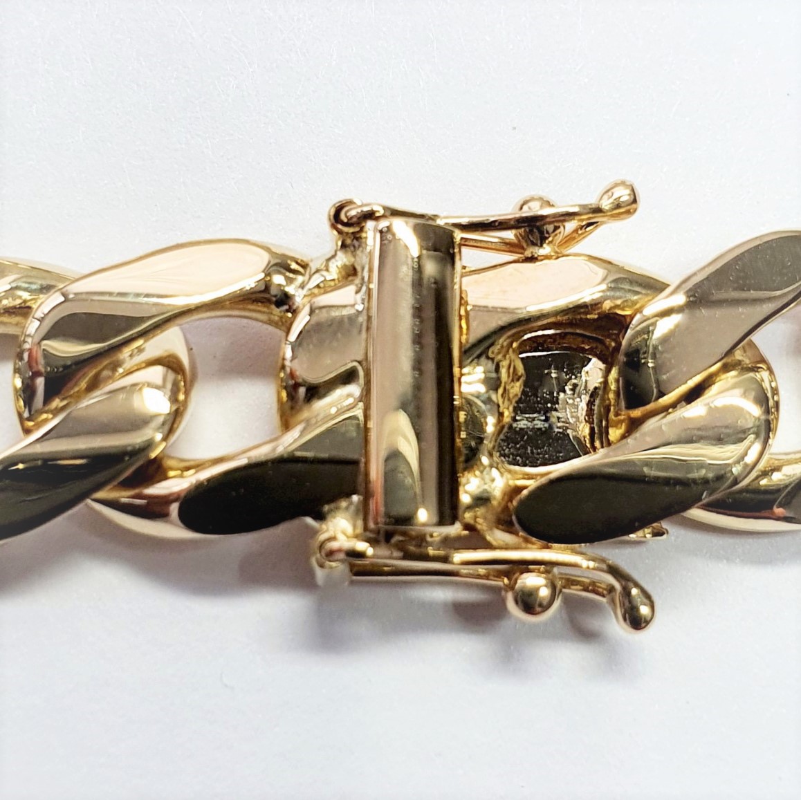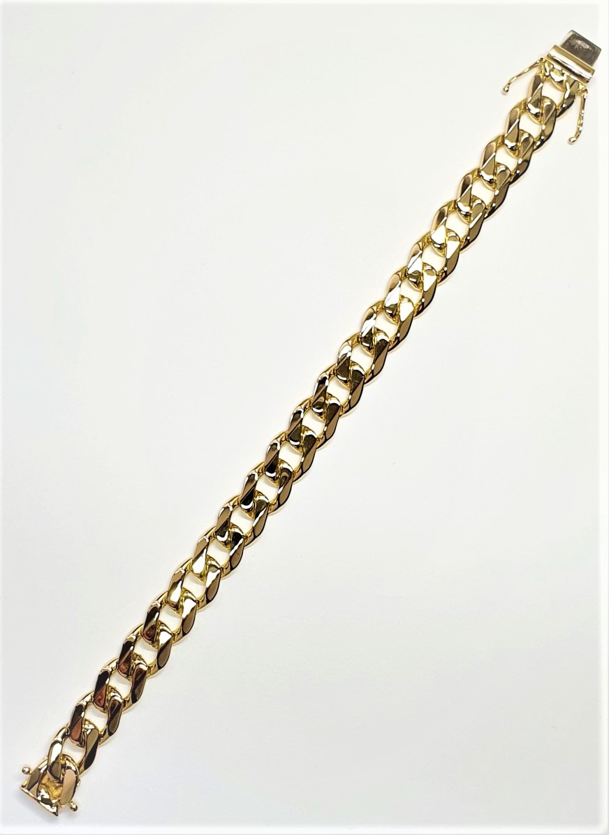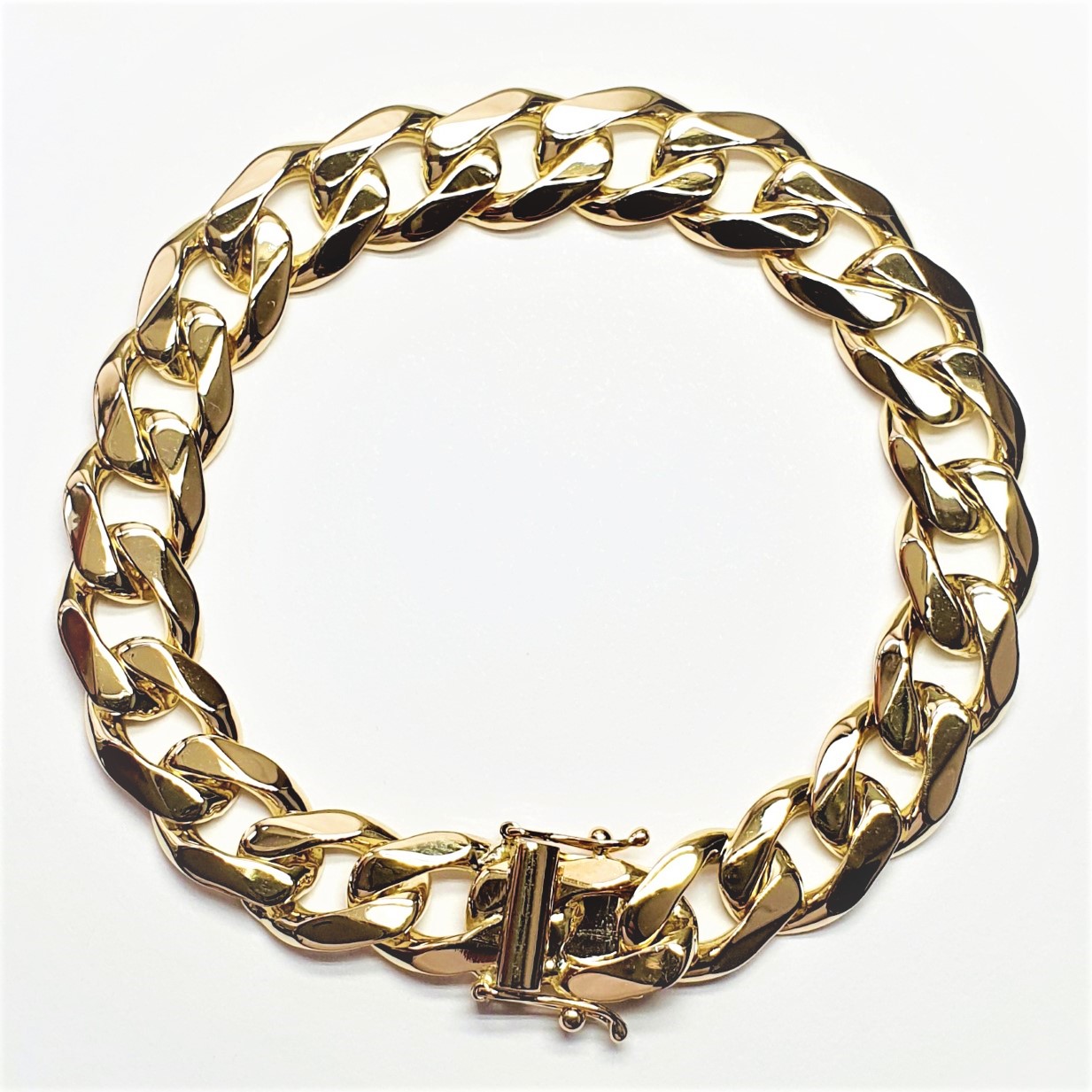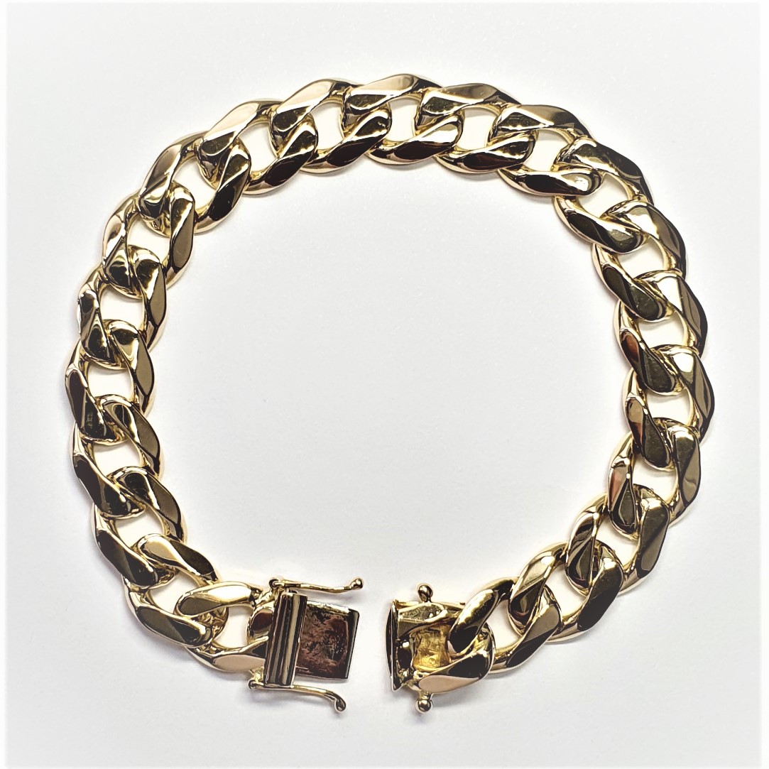 A luxurious solid 9ct yellow gold Highley polished gentleman’s curb link bracelet, fitted with a concealed box style clasp and two extra figure of eight safety clasps one each side. A timeless design that is made to last.