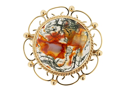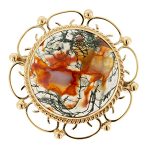 This gorgeous hand made brooch features a domed round moss agate stone, that has been set in a 9ct yellow gold rub over setting with an open back bezel. The open back setting allows maximum light to reach and enhance the extraordinary agate stone. The stone is semi-translucent and exhibits glorious dendritic inclusions of orangish red and deep green that swirl throughout.