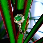 Furthermore, twelve brilliant round-cut diamonds totalling 0.27 carats surround the emerald, adding mesmerizing brilliance and allure to the ensemble. Each diamond reflects light with unparalleled beauty, enhancing the ring’s overall splendour.