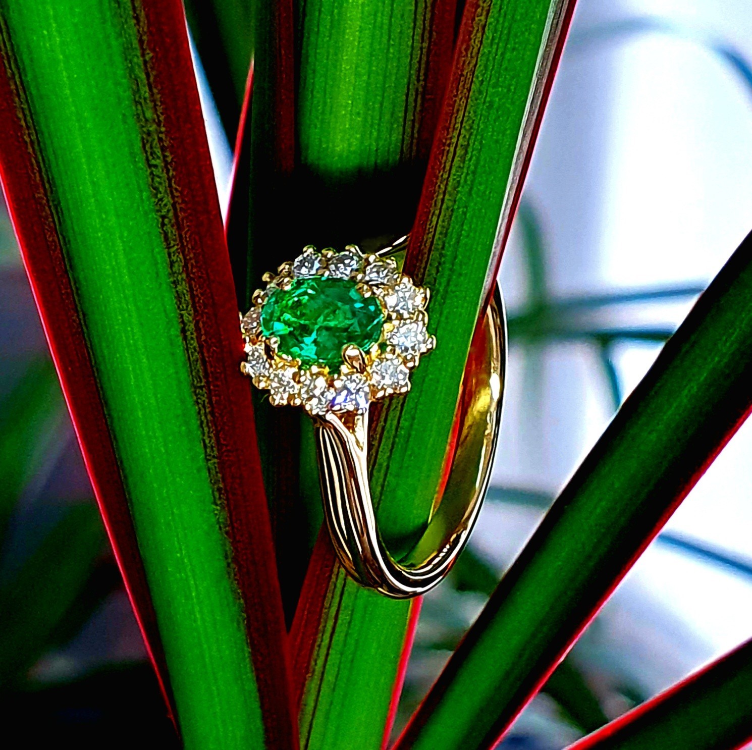 Introducing The Highgate 18ct Yellow Gold Oval Emerald and Diamond Cluster Ring RA00695, exclusively from the City of London Jewellers.