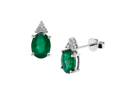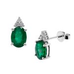 City of London Jewellers present these gorgeous 18ct white gold oval stud earrings, each Set with a single oval bright vibrant green emerald measuring 8mm x 6mm, with a three sparkling round white diamonds set into a triangular shape to the top of each earring.