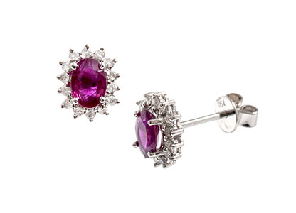 City of London Jewellers present these gorgeous 18ct white gold oval halo stud earrings, each Set with a single oval bright vibrant red ruby, surrounded with a halo of sparkling round white diamonds.