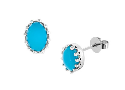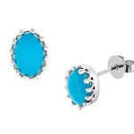 A beautiful eye catching design that is sure to attract admiring glances. These beautiful cabochon cut turquoise are mounted in 9ct white gold royal crown settings which have twelve claws on each earring, giving an ornate style that compliments the pastel sky blue of the turquoise .