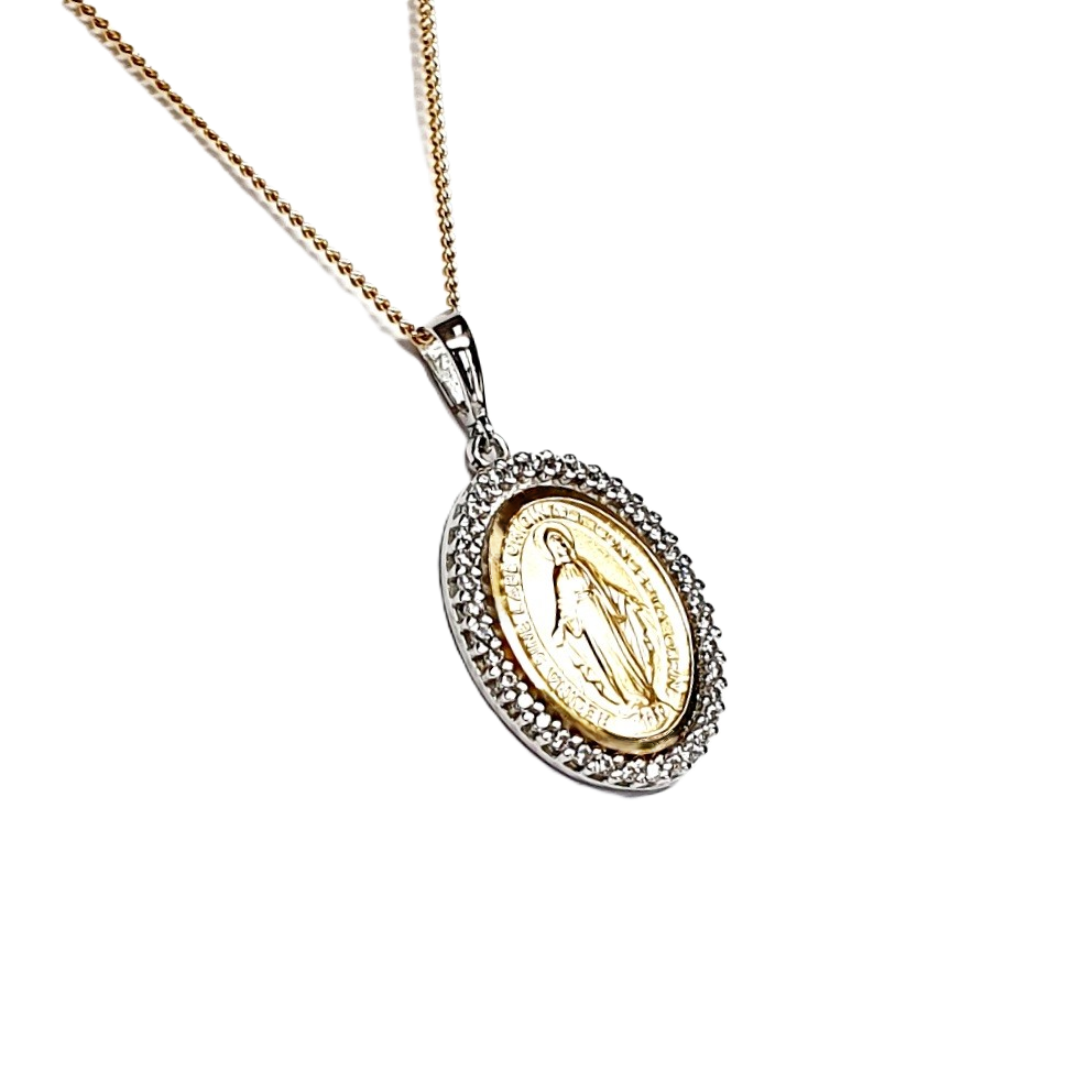 Furthermore, the front displays a yellow gold Virgin Mary with a shiny white cubic border set in 9ct white gold.