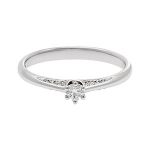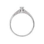 A graceful 18ct white gold ring with an intricate and innovative design. The four side edges of the shoulders are each set with five small round brilliant cut diamonds, enhancing the main centre diamond. A classic design with a refreshing added embellishment that she will love.
