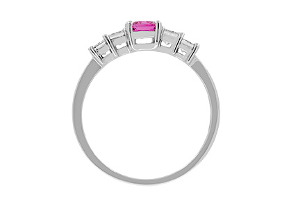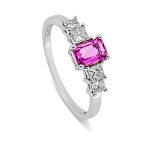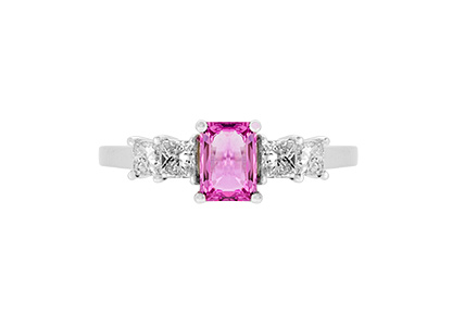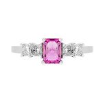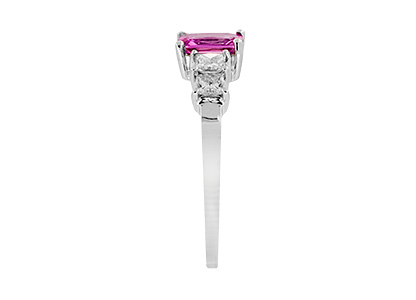 To begin with, this 18ct white gold ring showcases a vivid pink step-cut sapphire in a portrait claw setting—clean, architectural, and full of colour. The centre stone measures 0.59ct.