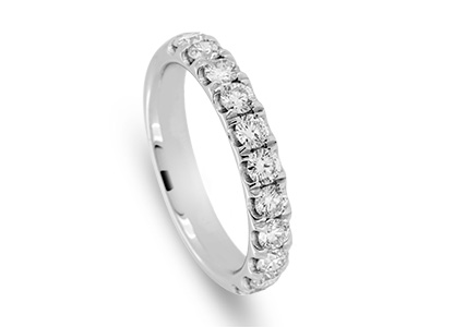 This beautiful platinum and diamond half eternity ring is set with a single row of eleven round brilliant cut white diamonds. These diamonds have been specially chosen for their exceptional fire and sparkle, which gives this ring an elegance that makes it special. A gorgeous ring she will always cherish.