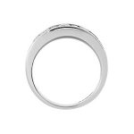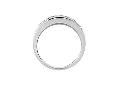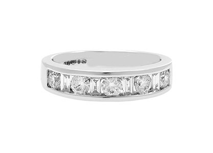 A modern smooth and tactile,950 platinum channel set half eternity ring, set with five round brilliant cut diamonds and four alternating baguette cut diamonds, chosen for their exceptional sparkle and fire. This mixture of the two contrasting cuts captures light from all angles which creates a dazzling display of sparkle and fire that will also capture instant attention.