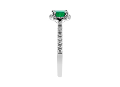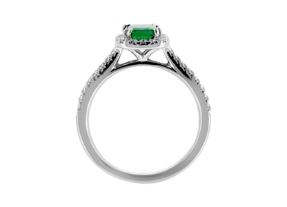 Designed to make a classic sophisticated style statement, the gorgeous rich regal green of this octagonal shaped emerald cut emerald is truly outstanding, framed with a contrasting halo of sixteen round brilliant cut white diamonds with a further eight sparkling diamonds cascading gracefully down each shoulder all set in the most luxurious pure and rare metal of all platinum. The perfect ring to surprise the lady in your life and reveal your true sense of romance, a very impressive piece that would make a truly special engagement ring or a colourful dress ring, for the lady with impeccable taste.
