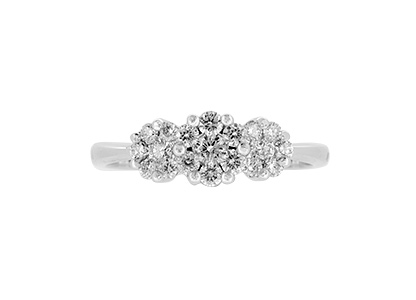 Elegant and sophisticated, a classic style with a modern twist. The centre diamond in each cluster has been invisibly set under a microscope with no visible claws, but with six claws on the outer diamonds which gives an illusion of three single diamonds.