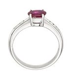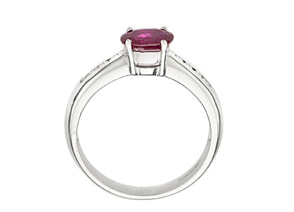 A luxurious and sophisticated platinum ring with a beautiful oval red ruby in a landscape setting with four claws, enhanced by four brilliant cut diamonds in a channel setting on both sides.