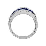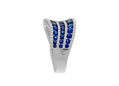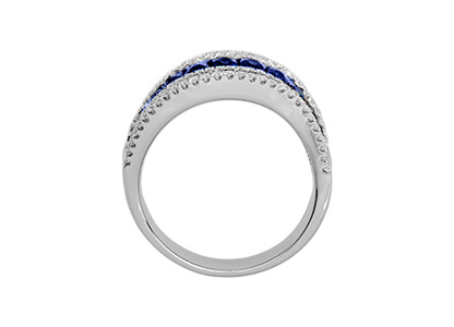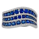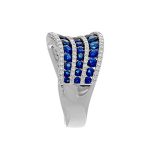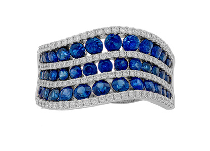 A luxurious and sophisticated platinum dress ring, with beautiful round blue sapphires and white diamonds in a flowing landscape setting , accentuated by the beautiful deep lustre of the highly polished platinum.