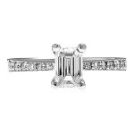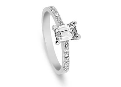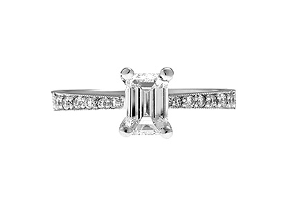 Luxurious and elegant, this stunning platinum and diamond ring is perfectly accentuated by the deep lustre of the polished platinum. The emerald cut diamond is set in a contemporary four claw setting and is enhanced by six round brilliant cut diamonds set in each shoulder, chosen for their exceptional sparkle and fire. This elegant design creates a dramatic effect that is both romantic and eye-catching.