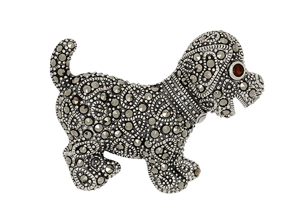A great gift for any dog lover, this cute little puppy dog brooch is encrusted with real marcasite stones and a single red garnet eye and is sure to compliment any outfit.