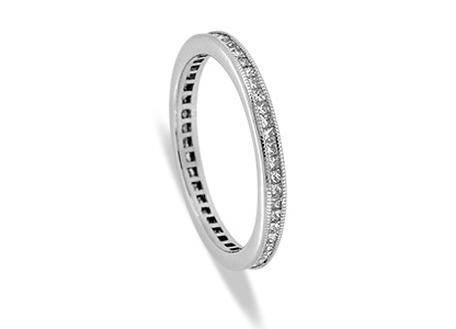 Eternally exquisite, this white gold diamond full eternity ring is made for the one you love. Designed with a perfect mill-grain setting, this gorgeous ring sparkles with breath-taking princess cut diamonds. Timeless style that will stand the test of time, this ring is sure to sweep your loved one off her feet and make her feel very special.