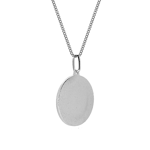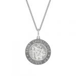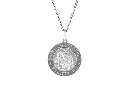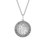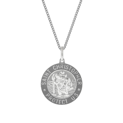 This lovely round saint Christopher pendant is made in Italy. The front has a matt finish with a contrasting plain diamond cutting around the border to give a smart crisp polished finish to the edge of the pendant, engraved with the words ( saint Christopher protect us).