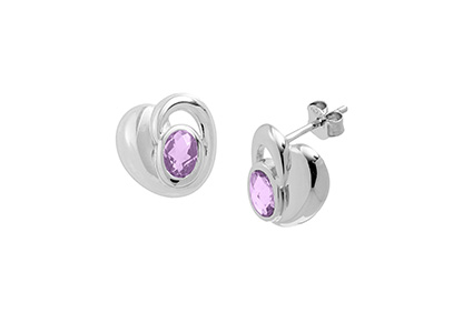 Sophisticated modern rounded heart style stud earrings, sculpted in real silver with a highly polished finish, encapsulating a stunning oval checker cut purple amethyst, in a secure rub over setting, with an anti tarnish rhodium finish.