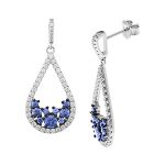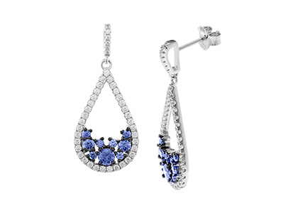 Gorgeous, sparkling drop earrings from the Bonita collection. Nine round brilliant cut blue cubic zirconia’s of assorted sizes set in an abstract design, encased and suspended by forty-one sparkling white stones in each earring. Finished to the highest standard using cubic zirconia’s of the finest quality to recreate the look and sparkle of real flawless diamonds at a fraction of the price. All with an anti tarnish rhodium finish.