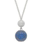 This delightful real silver necklace, features a majestic 14mm round ball with a black rhodium finish, encrusted with royal sapphire blue cubic Zirconia’s and a smaller sparkling white cubic Zirconia ball to the top, all hand set with a total of three hundred and forty-one stones of the finest quality.
