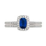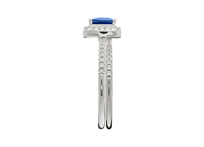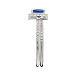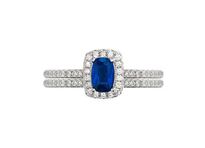 One modern style halo ring, set with a single royal sapphire blue cubic Zirconia, surrounded by sparkling white cubic Zirconia’s leading on to each shoulder, and one ring set with a single row of white matching cubic Zirconia’s, made to fit together under the top of the other with no gap.