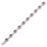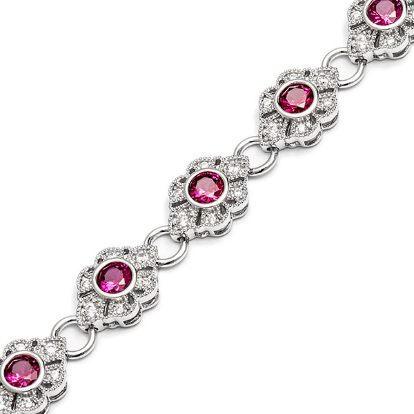 This gorgeous real silver bracelet is made up of ten separate clusters, each with a 5mm central sparkling ruby red cubic Zirconia in a rub over setting and enhanced by a further six grain set sparkling white cubic Zirconia’s creating ten exquisite stylish clusters each connected by a substantial solid plain polished ring to give a free flowing movement.