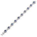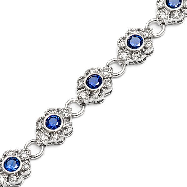 This gorgeous real silver bracelet is made up of ten separate clusters, each with a 5mm central sparkling sapphire blue cubic Zirconia in a rub over setting and enhanced by a further six grain set sparkling white cubic Zirconia’s creating ten exquisite stylish clusters each connected by a substantial solid plain polished ring to give a free flowing movement.