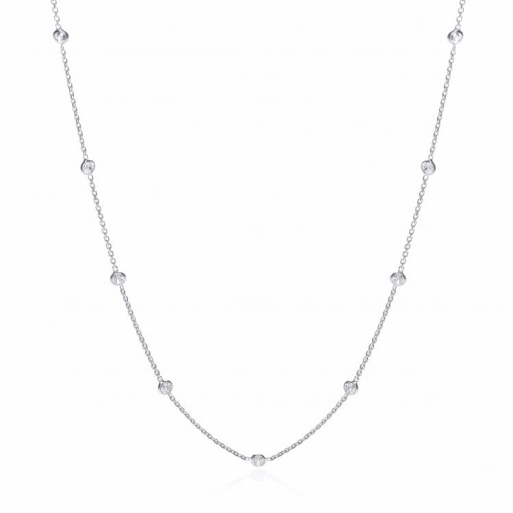 This gorgeous chain can be worn at 16inch or 18inches and is set with eleven round brilliant cut cubic zirconia’s, with a highly polished anti tarnish rhodium finish.