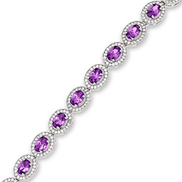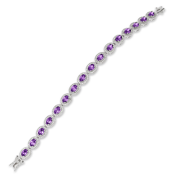 This gorgeous classic style, oval cluster bracelet from the Bonita Jewels collection, is sure to turn heads with admiring glances. Crafted from real silver into sixteen oval shaped clusters, set with sparkling white and amethyst purple colour cubic Zirconia’s. Each cluster is linked for a free flowing movement.