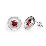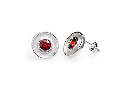 Be noticed with these beautiful modern real silver stud earrings set with a bold round checker cut Mozambique garnet centre, with highly polished top and side edges and a sunken contrasting matt finish surround.