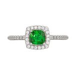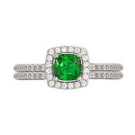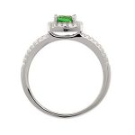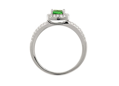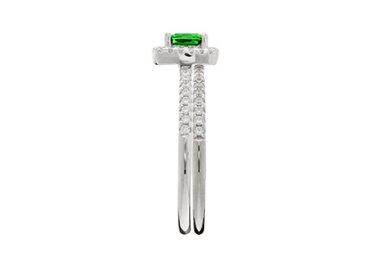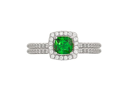One modern style halo ring, set with a single emerald green cushion shape cubic Zirconia, surrounded by sparkling round white cubic Zirconia’s leading on to each shoulder, and one ring set with a single row of white matching cubic Zirconia’s, made to fit together under the top of the other with no gap.