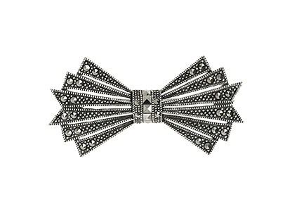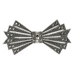This brooch would make a dazzling addition to any outfit. A distinctive art deco style bow design with bold lines, encrusted with gorgeous square marcasite’s to the center fanning out to the beautiful round marcasite’s to the edges.