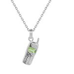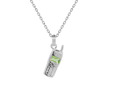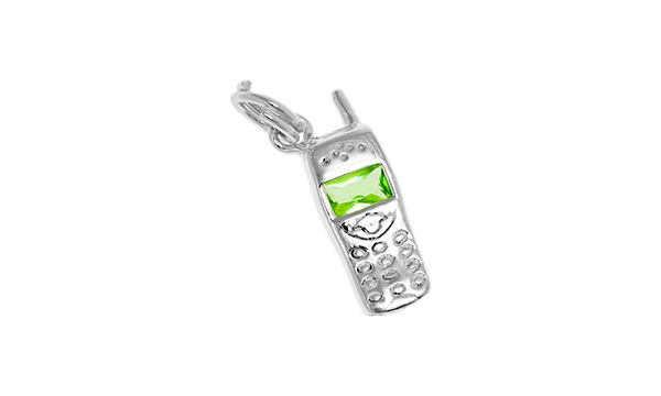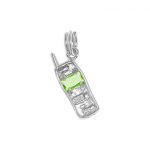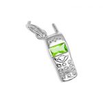 Created in real sterling silver and set with a lime green cubic zirconia to imitate the LED panel of a real phone. This style of mobile phone was used not so long ago, but it will not be long until people will think of this as an antique, (to be quite honest with you I still have one, and yes it still works!).