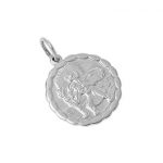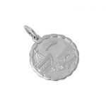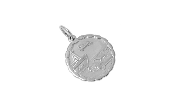 This beautiful round Saint Christopher pendant has a lovely scalloped pattern to the front edge and the back shows a car, ship and aeroplane, symbolizing travel.
