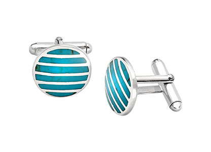 These classic round shaped cufflinks slightly domed and inlaid with Turquoise evokes the style of todays modern city executive.