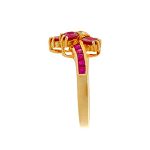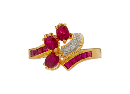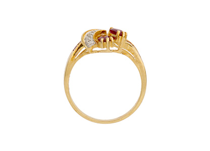 This glamorous 18ct yellow gold diamond and ruby ring is simply breath-taking. A beautiful collection of blood red rubies, which are accentuated with four small diamonds.