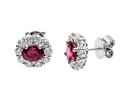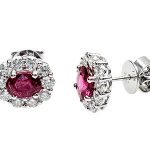 City of London Jewellers present these gorgeous 18ct white gold Oval Ruby & Diamond Cluster Earrings, each Set with a single oval bright vibrant red ruby, surrounded with a halo of sparkling round white diamonds.